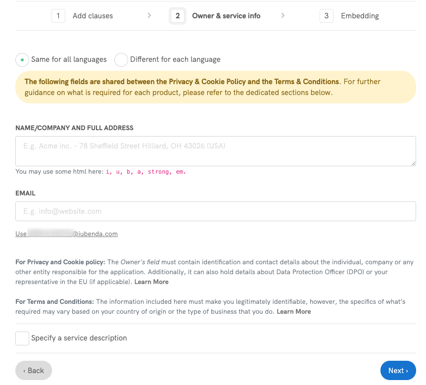 Uma vez que os Termos de Serviço são contratos legalmente vinculantes, é importante declarar dados de contato legítimos aqui. Além disso, considere que em muitos casos, conforme o Direito do Consumidor, os clientes devem poder entrar em contato com você se houver necessidade.