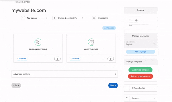 Conforme indicado na imagem acima, as cláusulas mais procuradas são pré-selecionadas por padrão como parte de uma configuração básica, mas você pode desfazer a seleção ou adicionar mais cláusulas onde for necessário. As cláusulas são separadas em módulos intuitivos, com botões de guias para ajudá-lo em todo o processo de configuração.