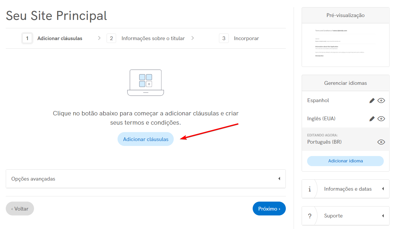 Isto abrirá uma janela que permite selecionar e editar as cláusulas que você deseja acrescentar. Se for a primeira vez que você estiver usando o Gerador de Termos e Condições, você verá o seguinte:
