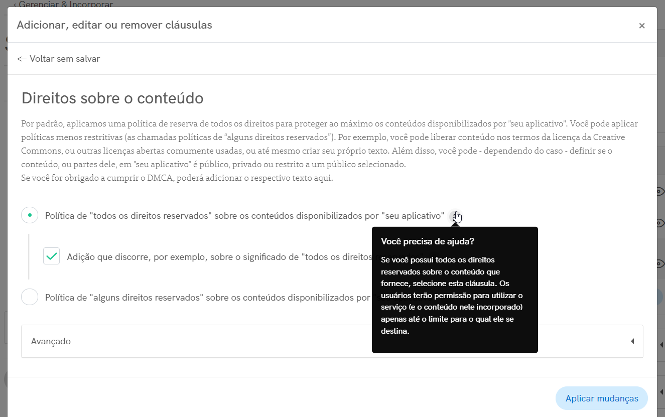 Clique no botão Aplicar alterações na parte inferior direita para salvar suas customizações. Isso levará você de volta à janela “modal de cláusulas”. Se você terminou de customizar seus termos, você pode clicar em Salvar e fechar no canto direito desta janela e passar para a próxima etapa abaixo.