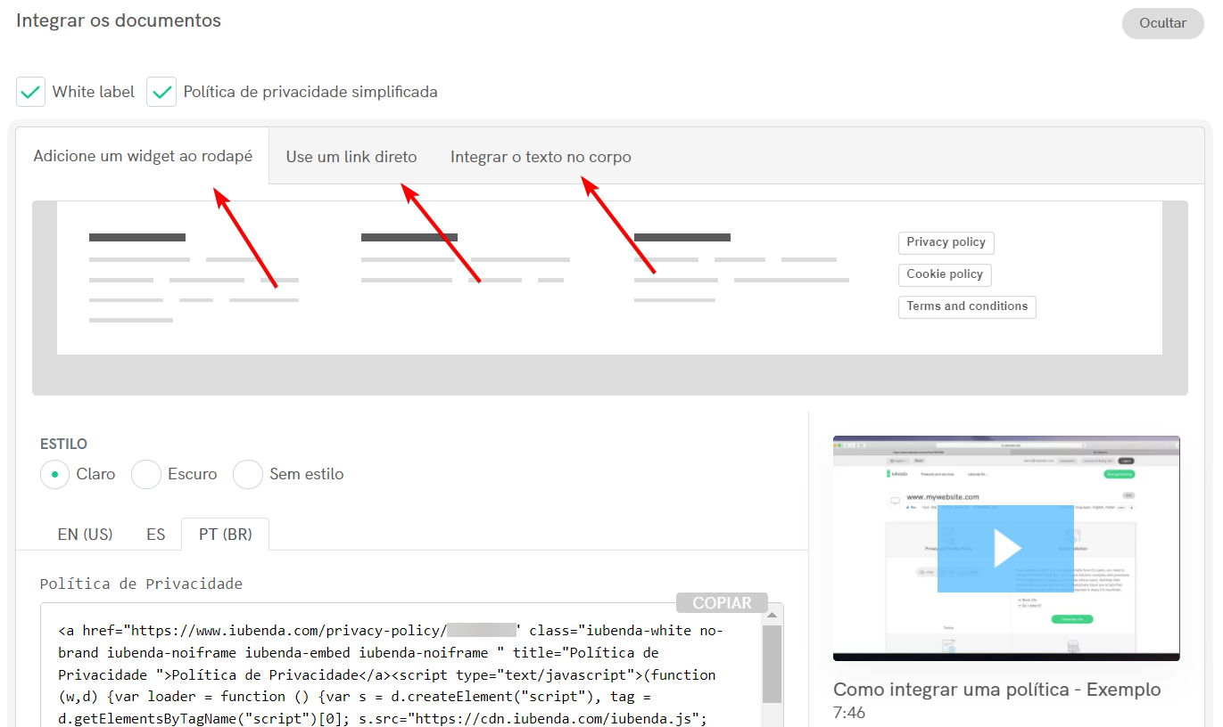 O último passo é integrar os termos que você acabou de criar a seu website/app. Isto é feito usando o código de integração ou link fornecido na página “integrar”.