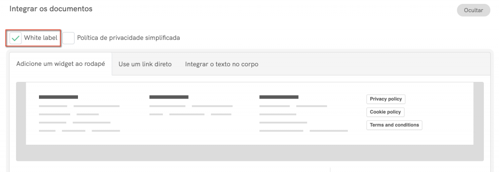 Copiar o código diretamente ainda aplicará o estilo iubenda (fontes, etc.) ao seu documento. Se desejar que o estilo do documento seja diretamente do seu site, selecione a opção de etiqueta em branco aqui.