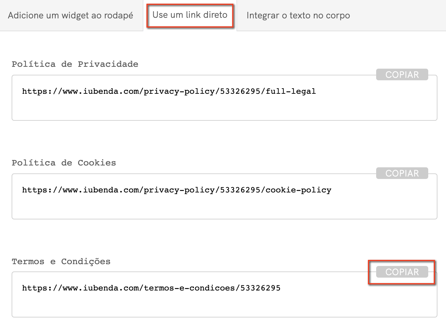 Para adicionar um link direto, clique em Use um link direto, procure “Termos e Condições” e clique em COPIAR