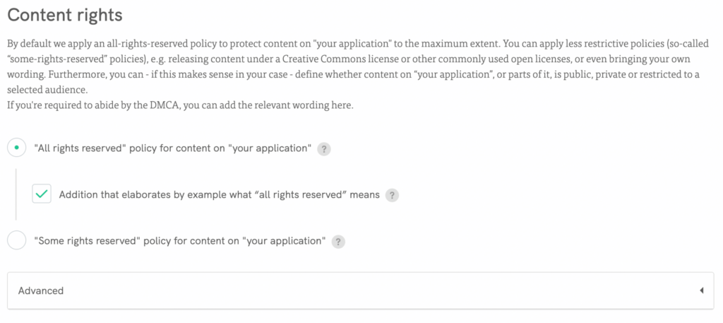 Crieuma cláusula personalizada ou selecione nossas cláusulas pré-elaboradas, incluindo cláusulas de direitos de conteúdo;