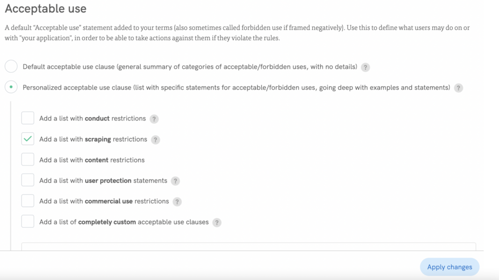 Adicione facilmente uma cláusula antirraspagem: Uso aceitável → Cláusula de uso aceitável personalizada (lista com declarações específicas para usos aceitáveis/proibidos, aprofundando-se com exemplos e declarações) → Adicionar uma lista com restrições de raspagem
