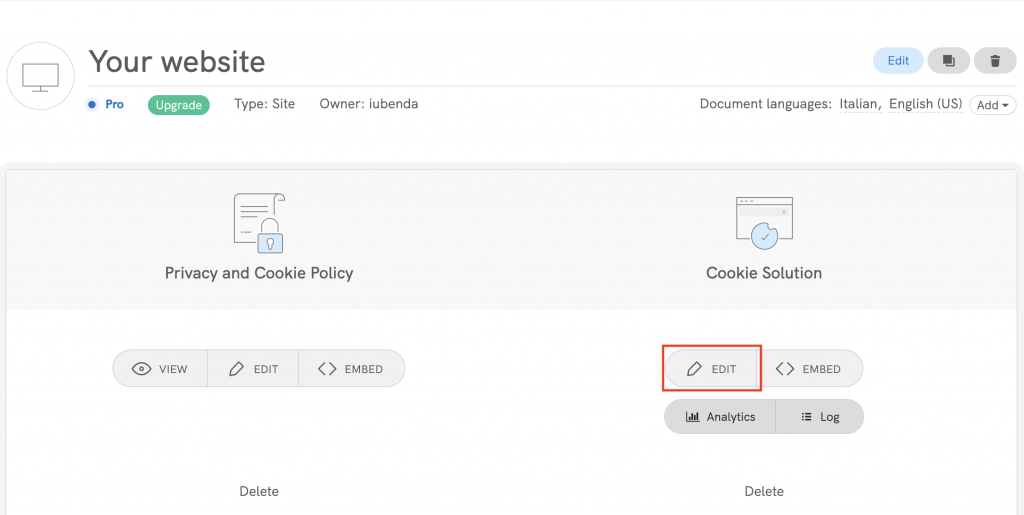 Para habilitar o TCF 2.0+ em sua Privacy Controls and Cookie Solution, acesse sua dashboard e clique no site/aplicativo que deseja atualizar. Em seguida, clique no botão Editar na área da Privacy Controls and Cookie Solution (se você ainda não ativou a Privacy Controls and Cookie Solution, aqui está um tutorial para te ajudar a começar).