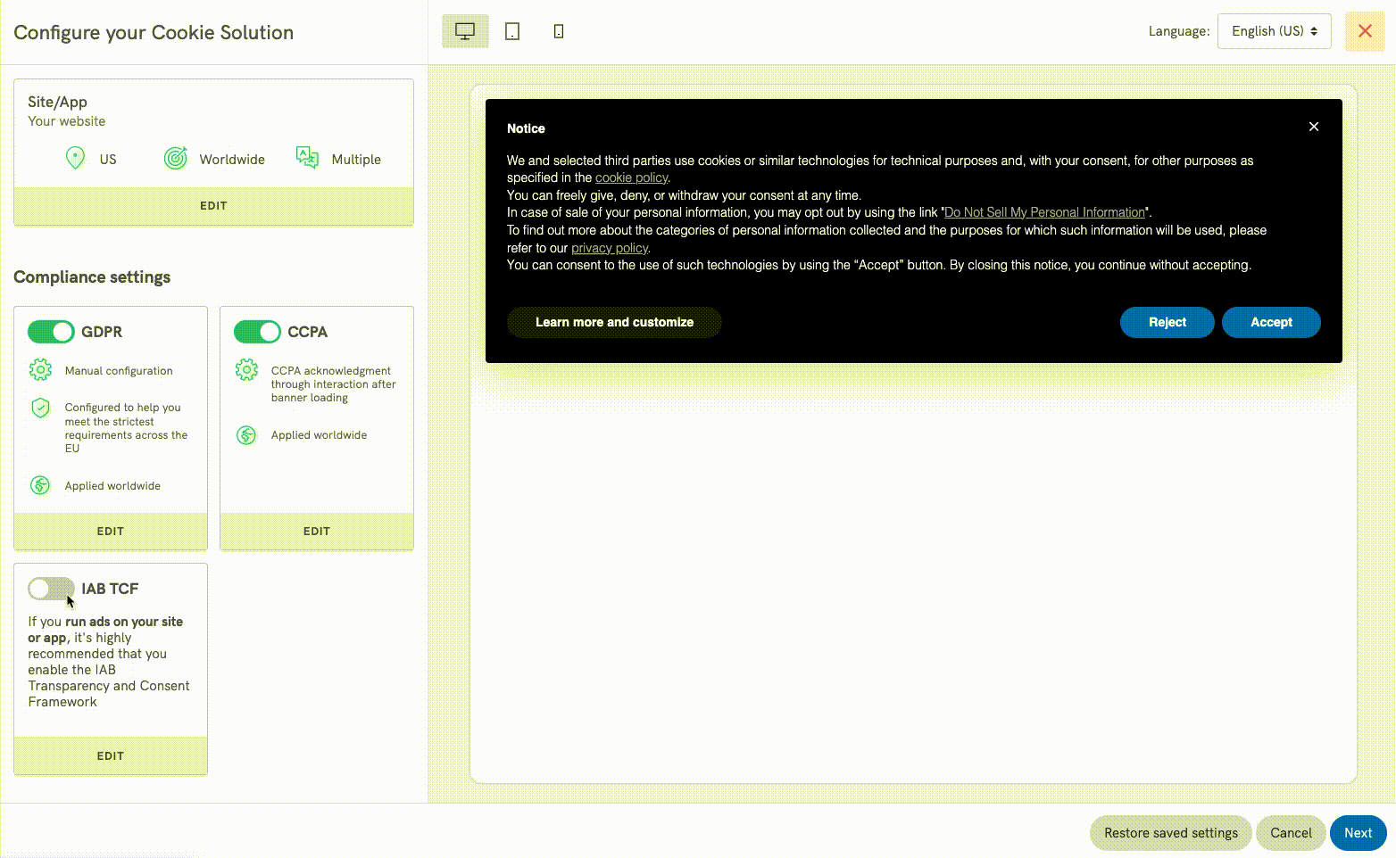 Observe que quaisquer alterações anteriores no texto do banner serão anuladas quando o TCF estiver ativado. Portanto, se você já editou o HTML ou o texto do banner, teste novamente com o texto padrão e os botões ativados.