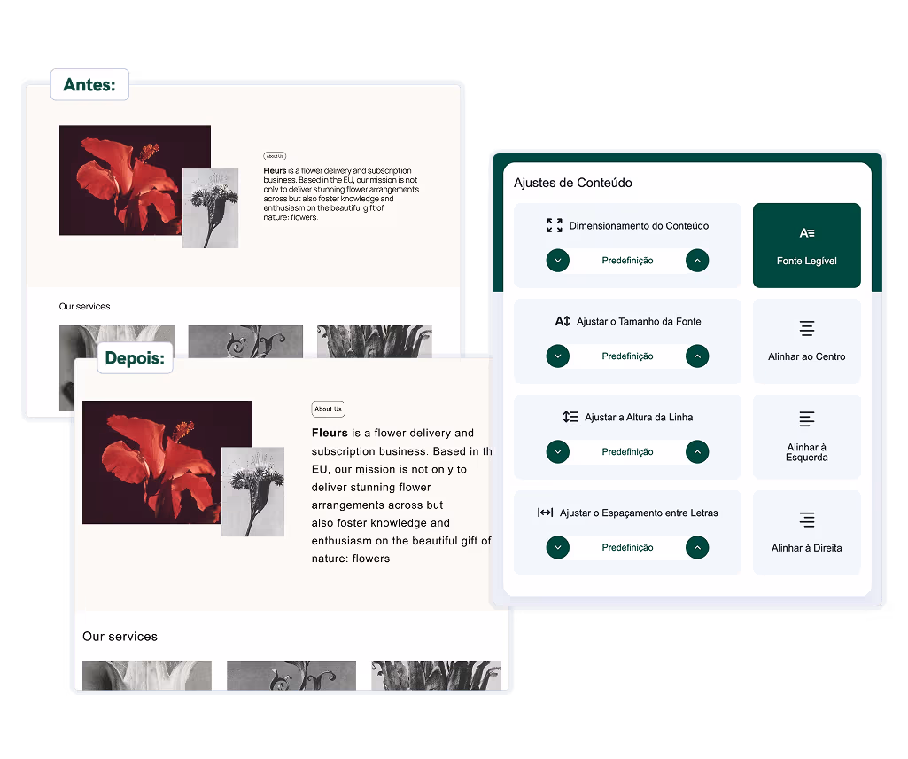 O nosso widget oferece aos seus visitantes total controlo sobre a forma como o conteúdo é exibido. Os utilizadores podem ajustar o tamanho da letra, a altura da linha e o alinhamento do texto com um único clique – ajudando as pessoas com deficiências visuais, dislexia ou deficiências cognitivas a navegar no seu site sem frustrações.
