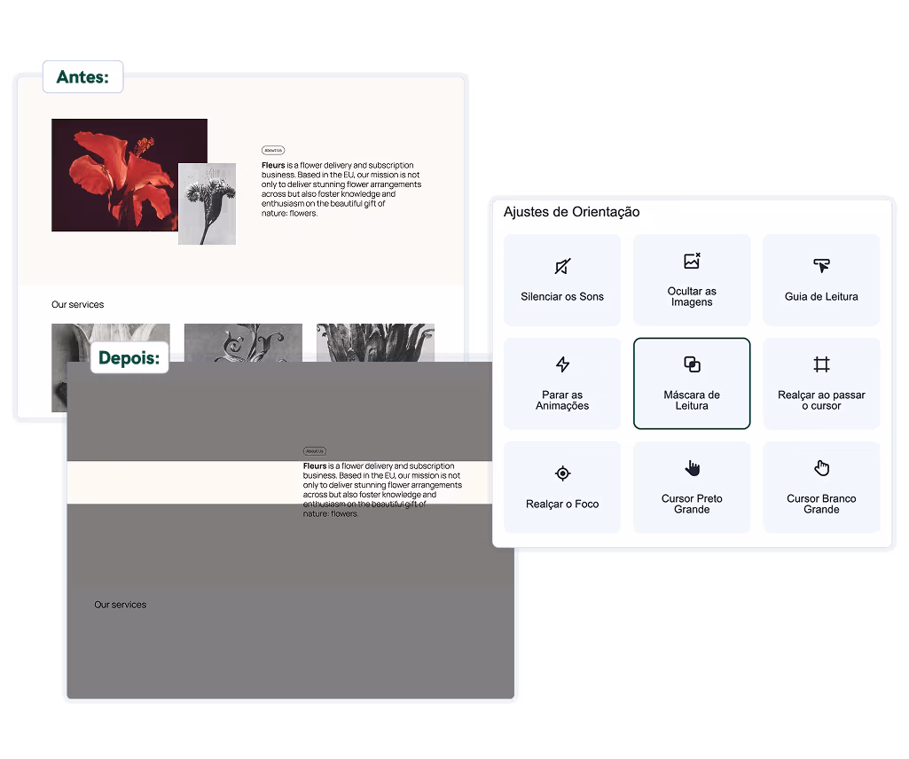 Para muitos utilizadores, as animações e os sons de um website podem ser incomodativos. As nossas ferramentas de orientação permitem que os visitantes silenciem sons, ocultem imagens, utilizem guias de leitura e parem animações – criando uma experiência de navegação focada que funciona para pessoas com TDAH, autismo ou epilepsia.