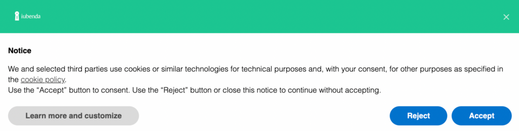 O botão Recusar permite que os utilizadores rejeitem todos os cookies de uma só vez. Eis um exemplo do banner de cookies da iubenda com um botão recusar válido: